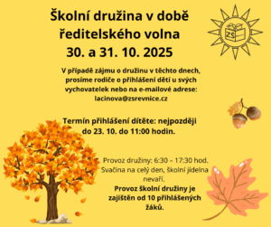8 Říjen Školní družina v době ředitelského volna Aktuality Komentáře nejsou povolené u textu s názvem Školní družina v době ředitelského volna